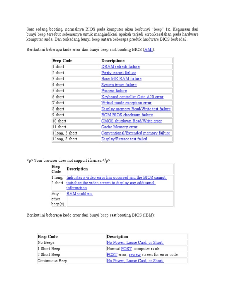 Beep 1 kali saja Tanda bahwa kondisi komputer baik Beep 1 kali panjang Terdapat problem di memory Beep 1 kali panjang dan 3 kali pendek Kerusakan di VGA card Beep 1 kali panjang dan 2 kali pendek Kerusakan di DRAM parity Beep terus menerus Kerusakan dimodul memory atau memory video.